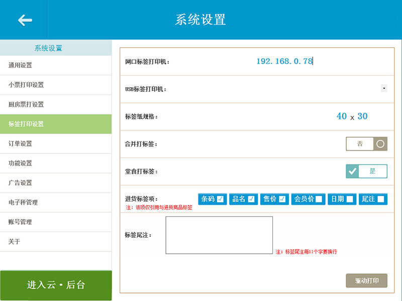 标签打印设置:采用网口标签机时,需要在“标签打印机IP”一栏,填写标签打印机的IP地址,IP必须和电脑IP