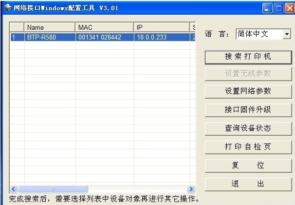 设置IP地址的流程和上面的打印机是一样的,只是修改IP地址的程序是BYNetWinConfig.exe,这个程序包含在“常用工具”里的“北洋网口打印机修改IPV3.01”。运行后,点击【搜索打印机】按钮,选择UDP模式,会显示当前能连接到的所有打印机,如下图: